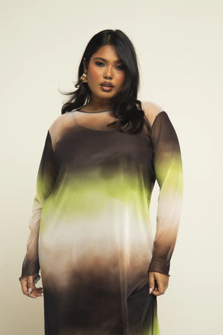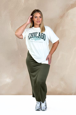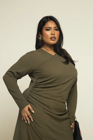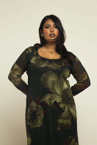 Curve Khaki Large Floral Scoop Neck Flared Skirt Midaxi Dress