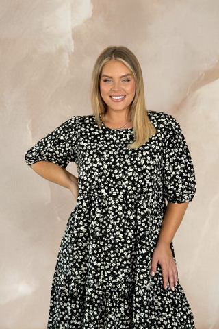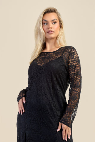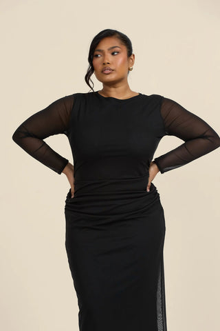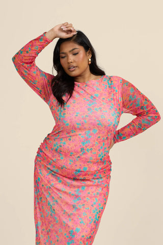Curve Mesh long sleeve midaxi dress in bright coral floral print
