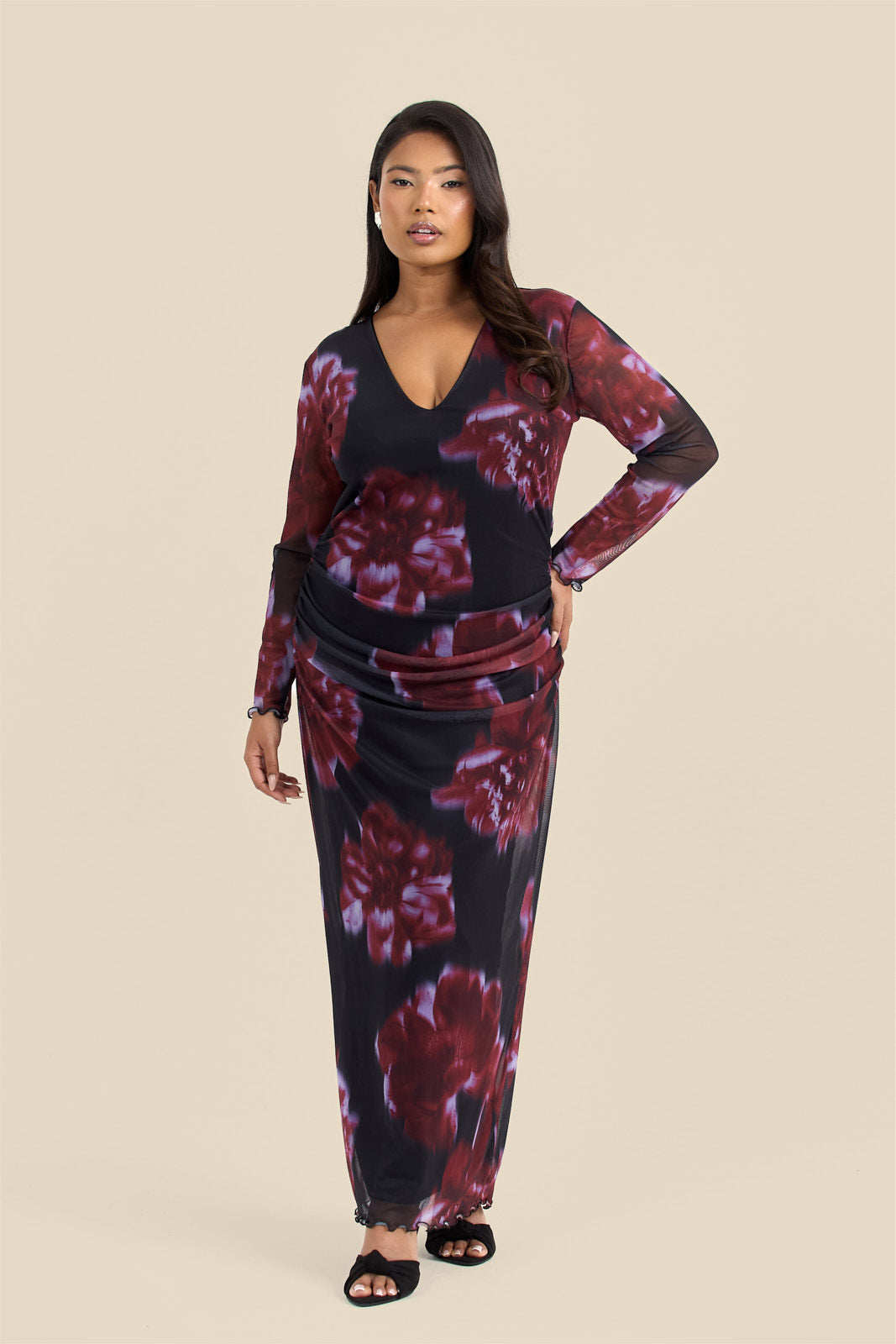 Description: Get ready to turn heads in our Curve V Neck ruched Midaxi Dress! With a flattering plunge neckline and eye-catching statement floral print, this dress is perfect for any occasion. Embrace your curves and stand out in style.