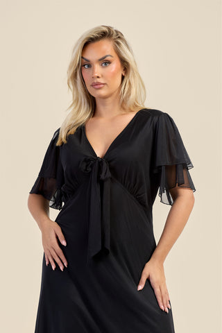 Curve Flutter Sleeve Black Mesh Tie Front Midi Dress