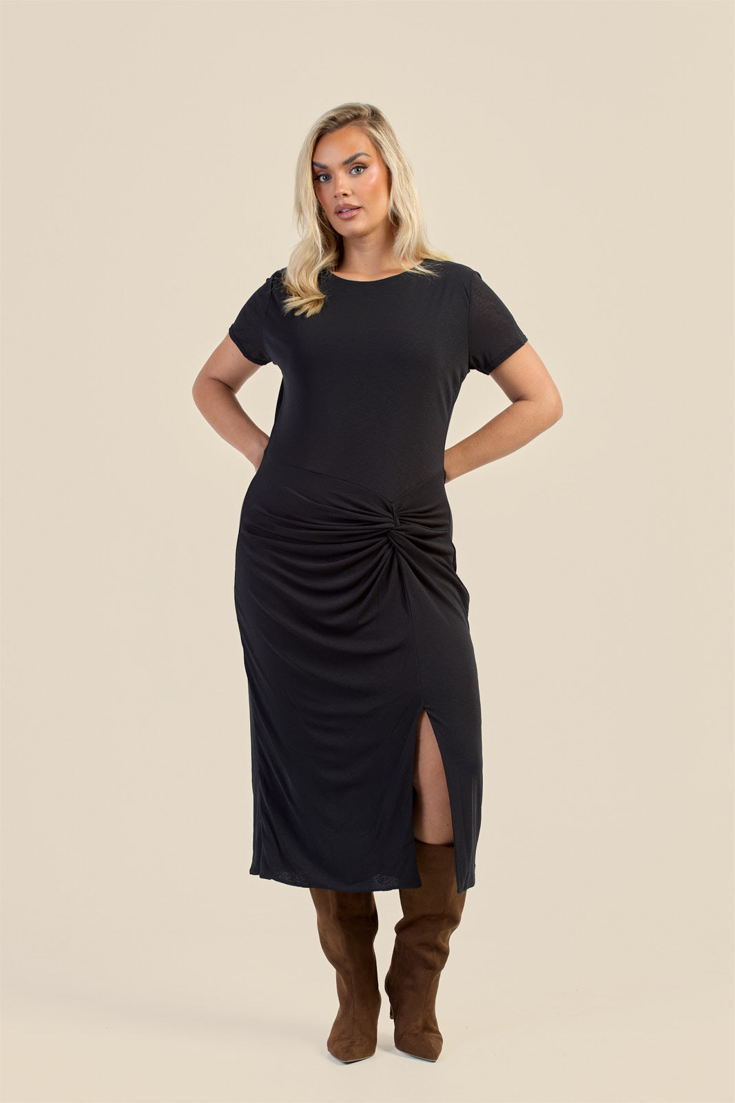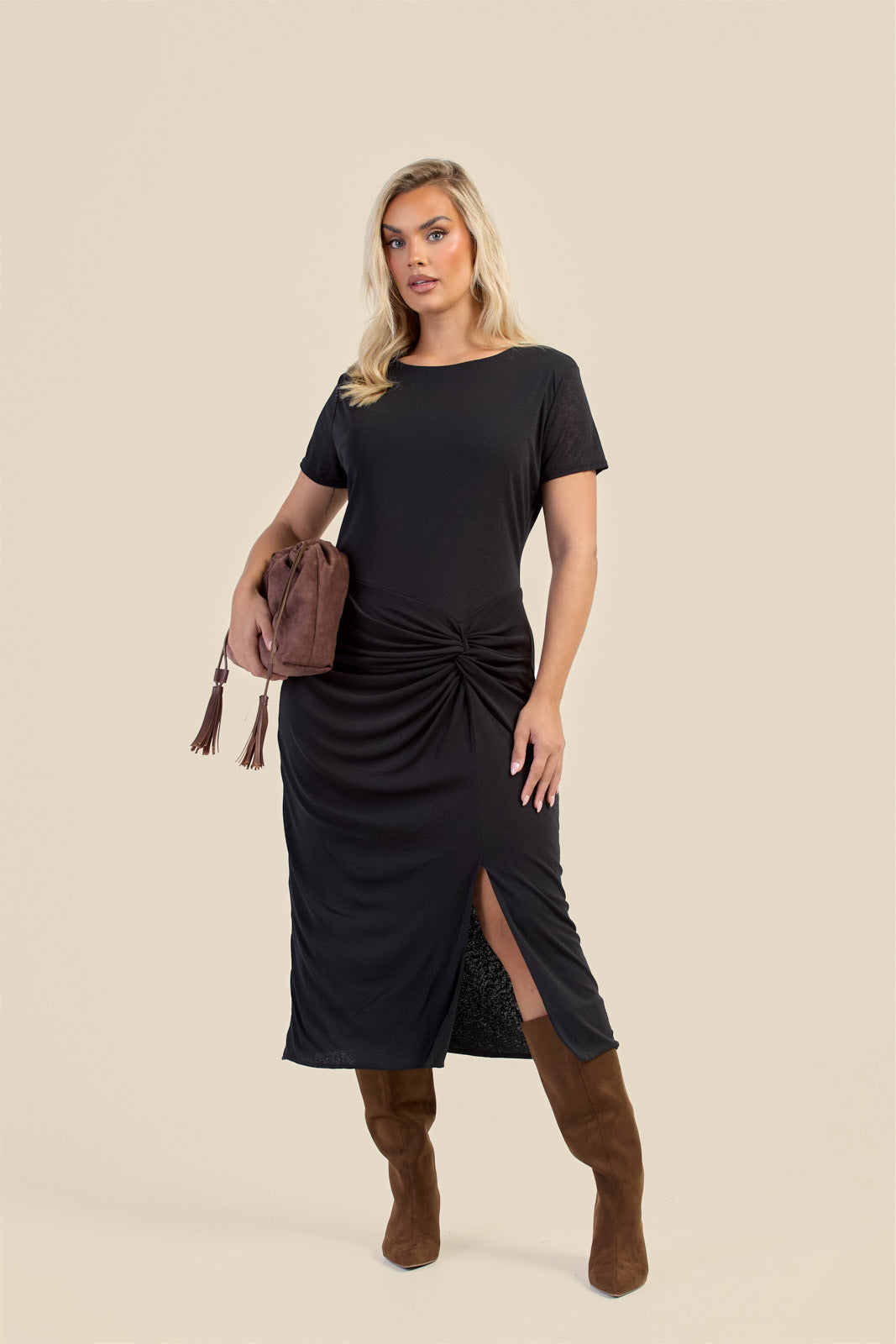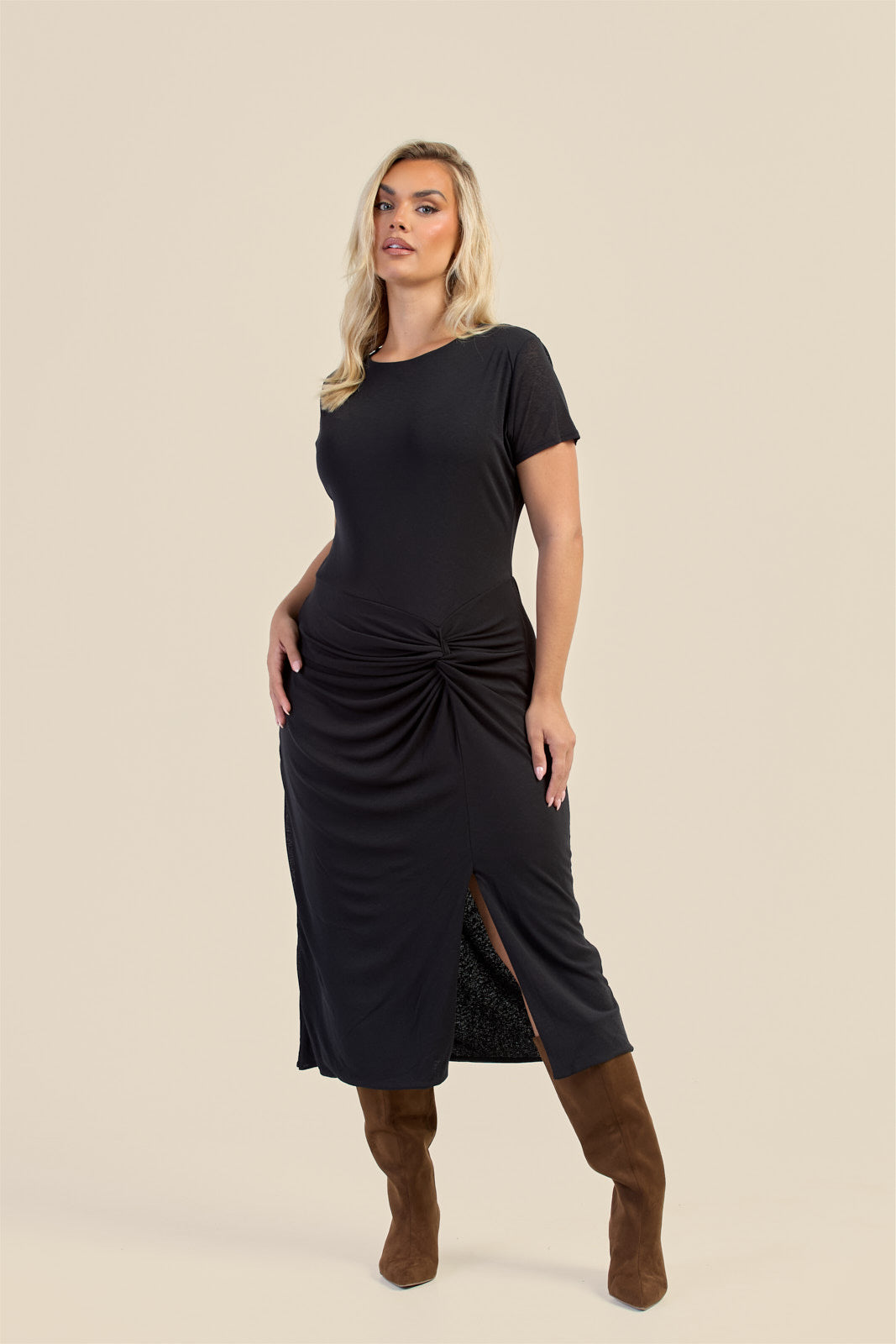 Step out in style with the Curve Textured Knit Knotted Front Midi Dress. Its playful knot detail adds a fun twist to the flattering textured knit fabric, hugging your curves in all the right places. Perfect for any occasion, this midi dress blends comfort and chic effortlessly—get ready to turn heads and feel fabulous all day long!