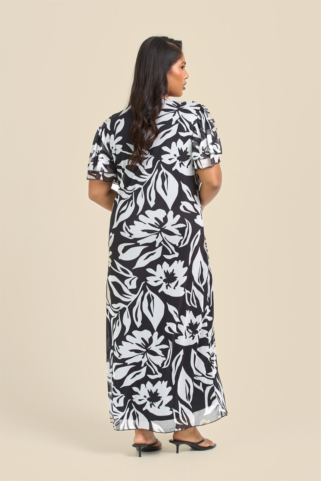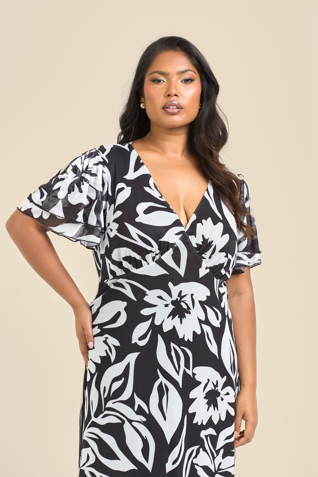 Step into a garden of style with this Plus Size Floral Mono Floral Print Flutter Sleeve Midi Dress. Its delicate flutter sleeves and charming floral print bring a fresh, playful vibe to your wardrobe. The plus size midi length mesh dress offers a perfect balance of elegance and ease, making it ideal for casual day to night outings.