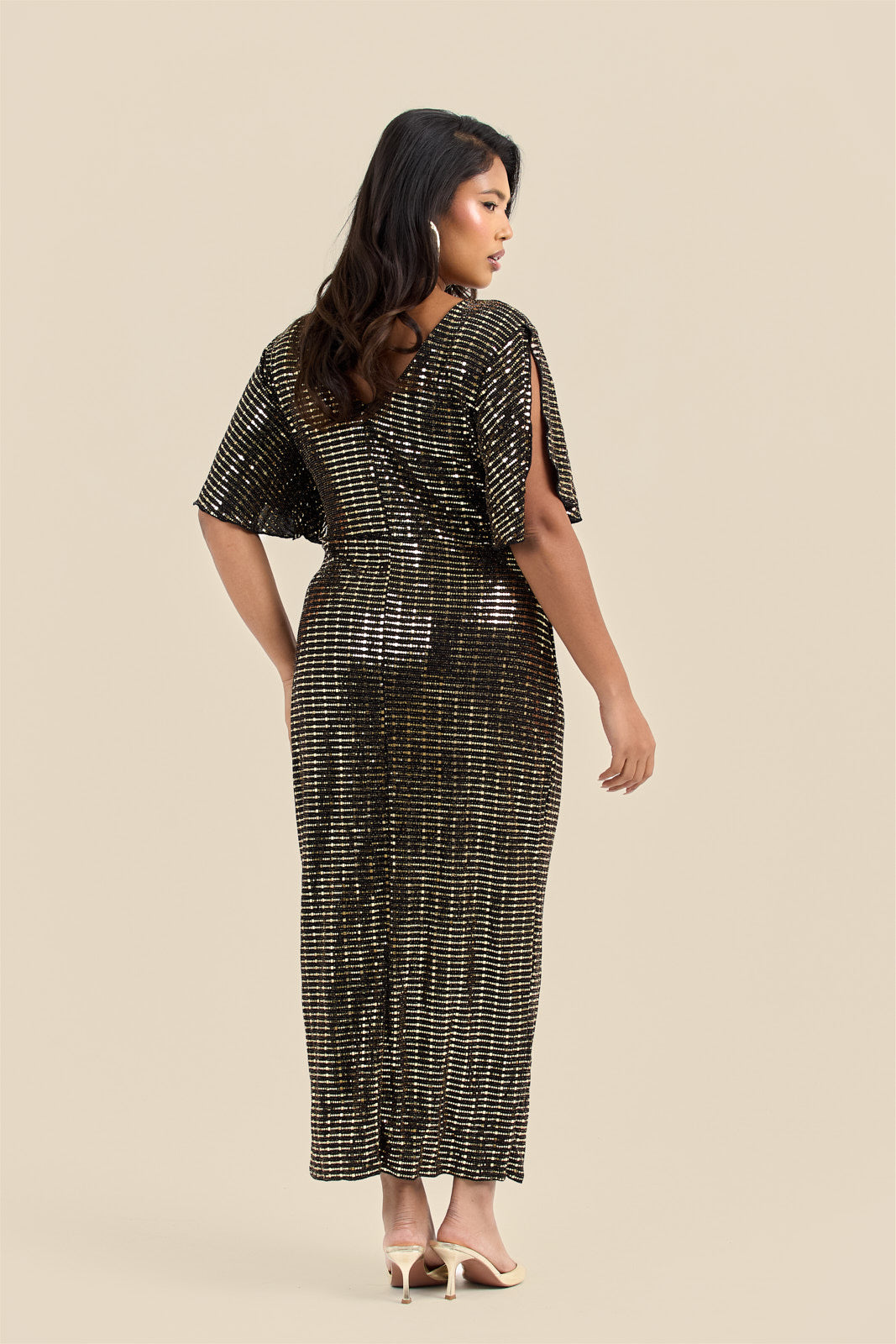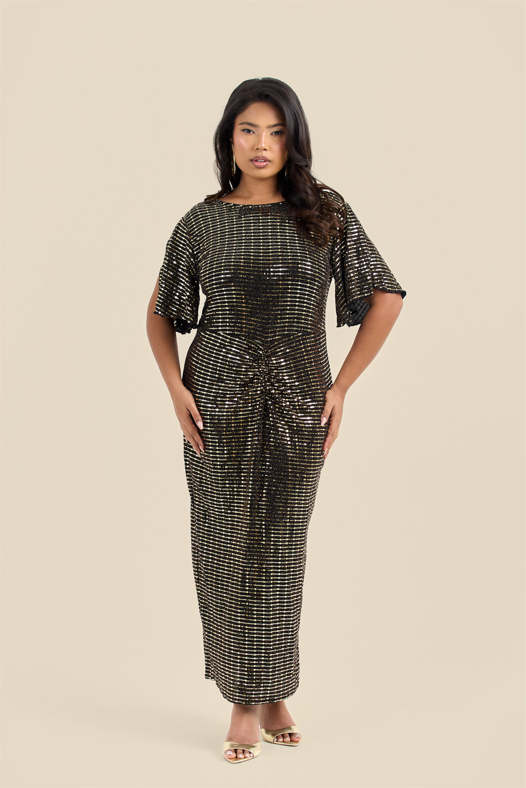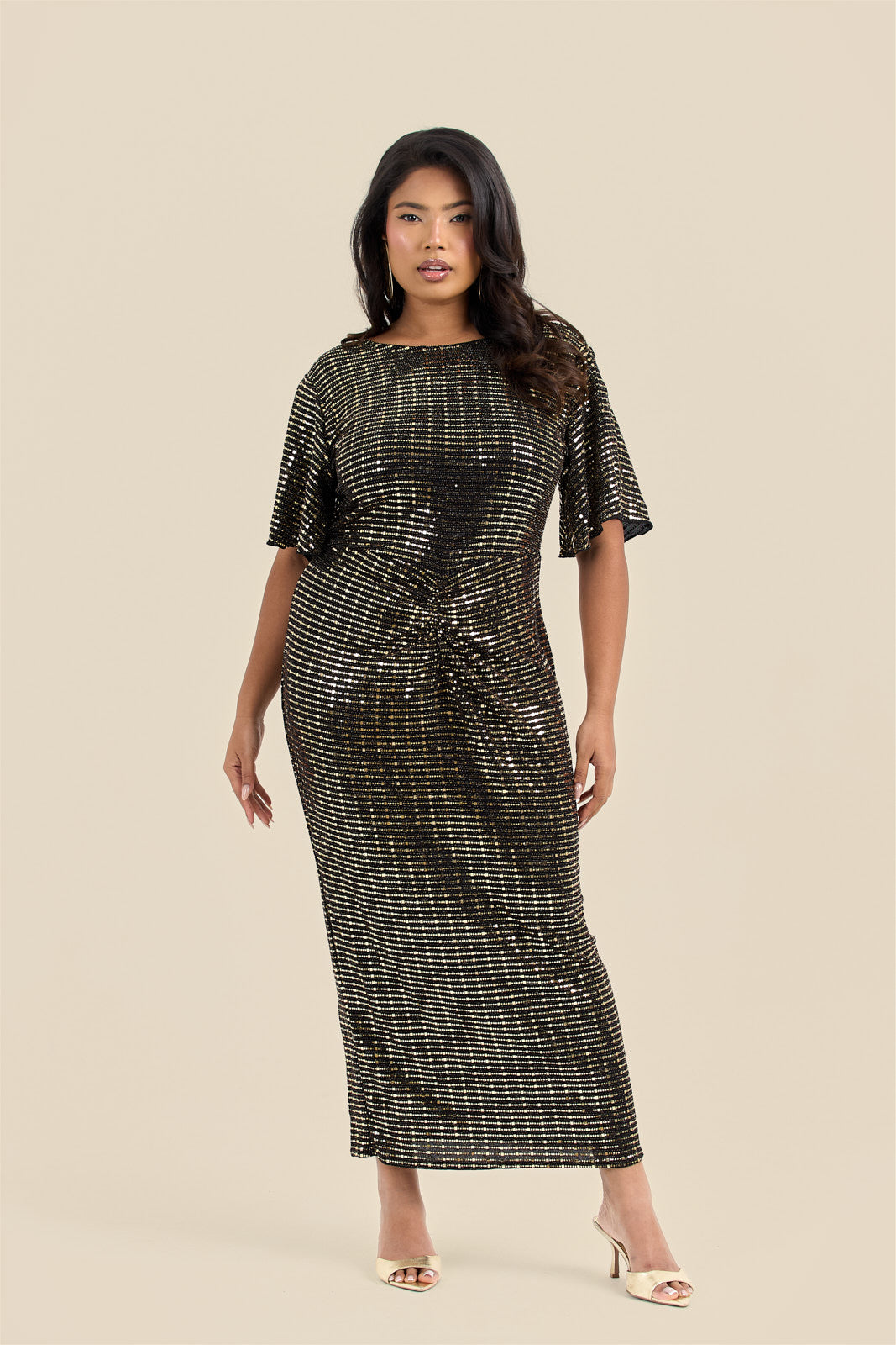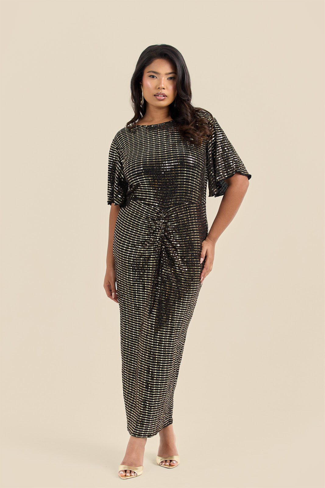 Steal the spotlight with this plus size gold sequin ruched flutter sleeve midi dress that's made for unforgettable nights. Horizontal striped sequins in gold on black fabric catch the light with every move, whilst the ruched front detail flatters and sculpts your silhouette. Flutter sleeves add dramatic movement, and the stretch fabric moves comfortably with you all night long.