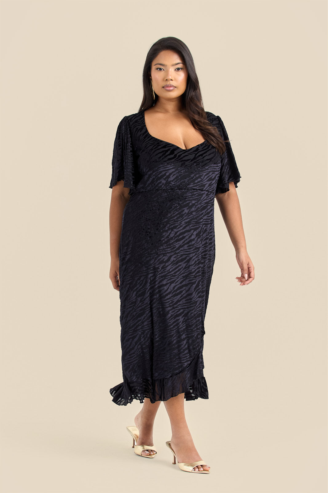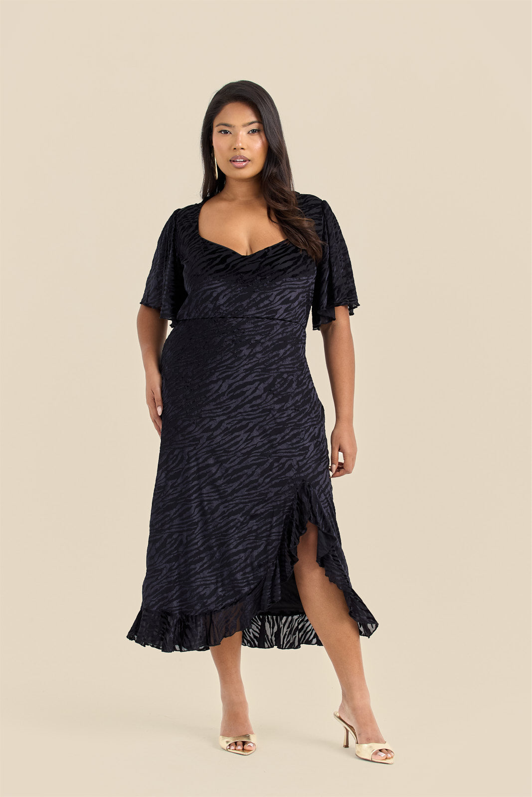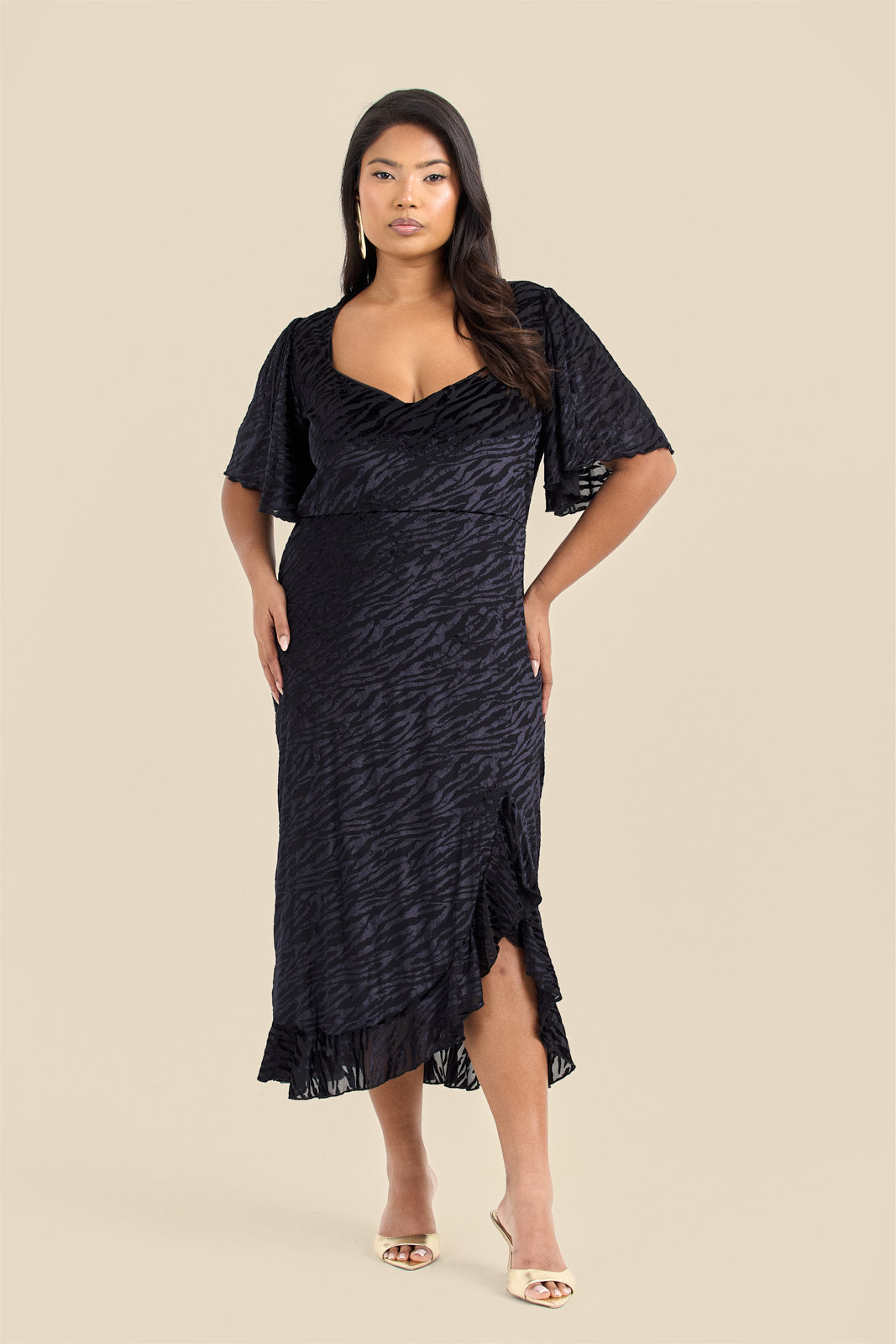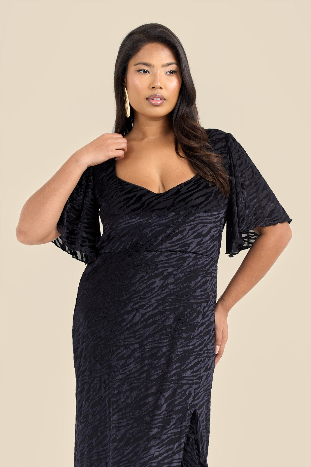 Feel like a wild and playful zebra in this curve-hugging midi dress! The jewel-coloured devore velvet adds a touch of sophistication, while the flutter sleeves add a flirty flair. Perfect for any occasion, this emerald green dress will make you stand out and show off your unique style. Exclamation point optional.