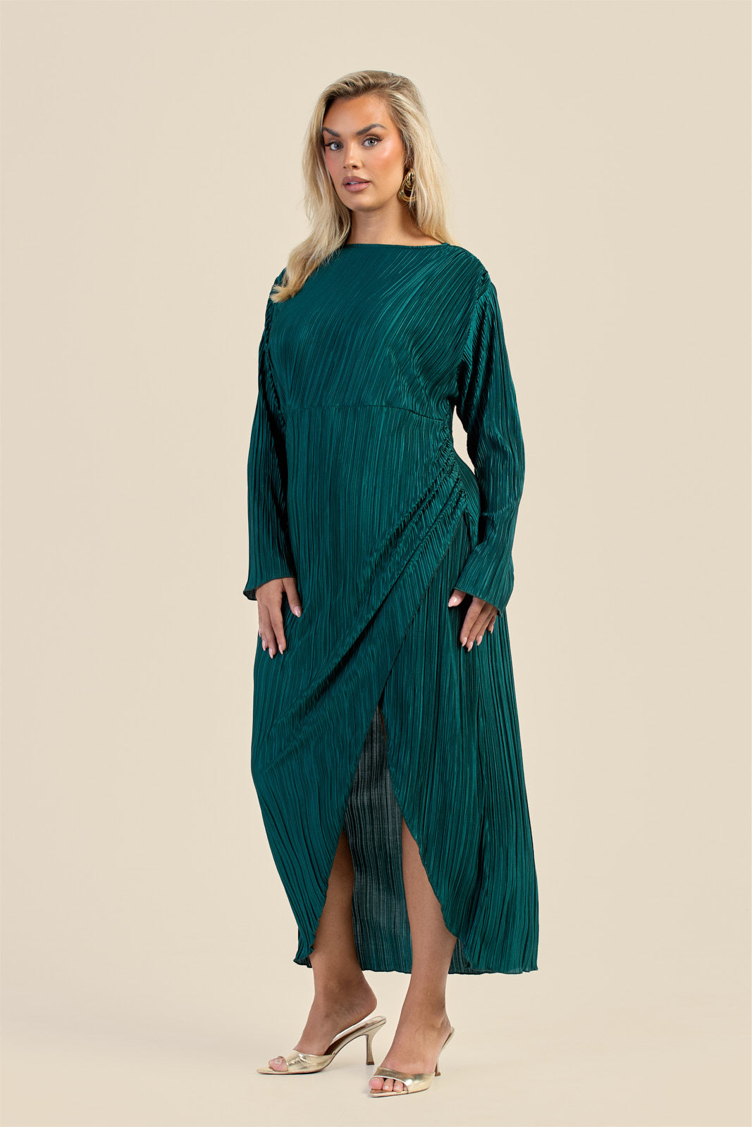 Sparkle and shine in our Curve Plisse Ruched Front Emerald Green Midaxi Dress. Perfect for any occasion, this jewel coloured dress will turn heads and make you feel like a gem. Dress to impress with this unique and playful piece.