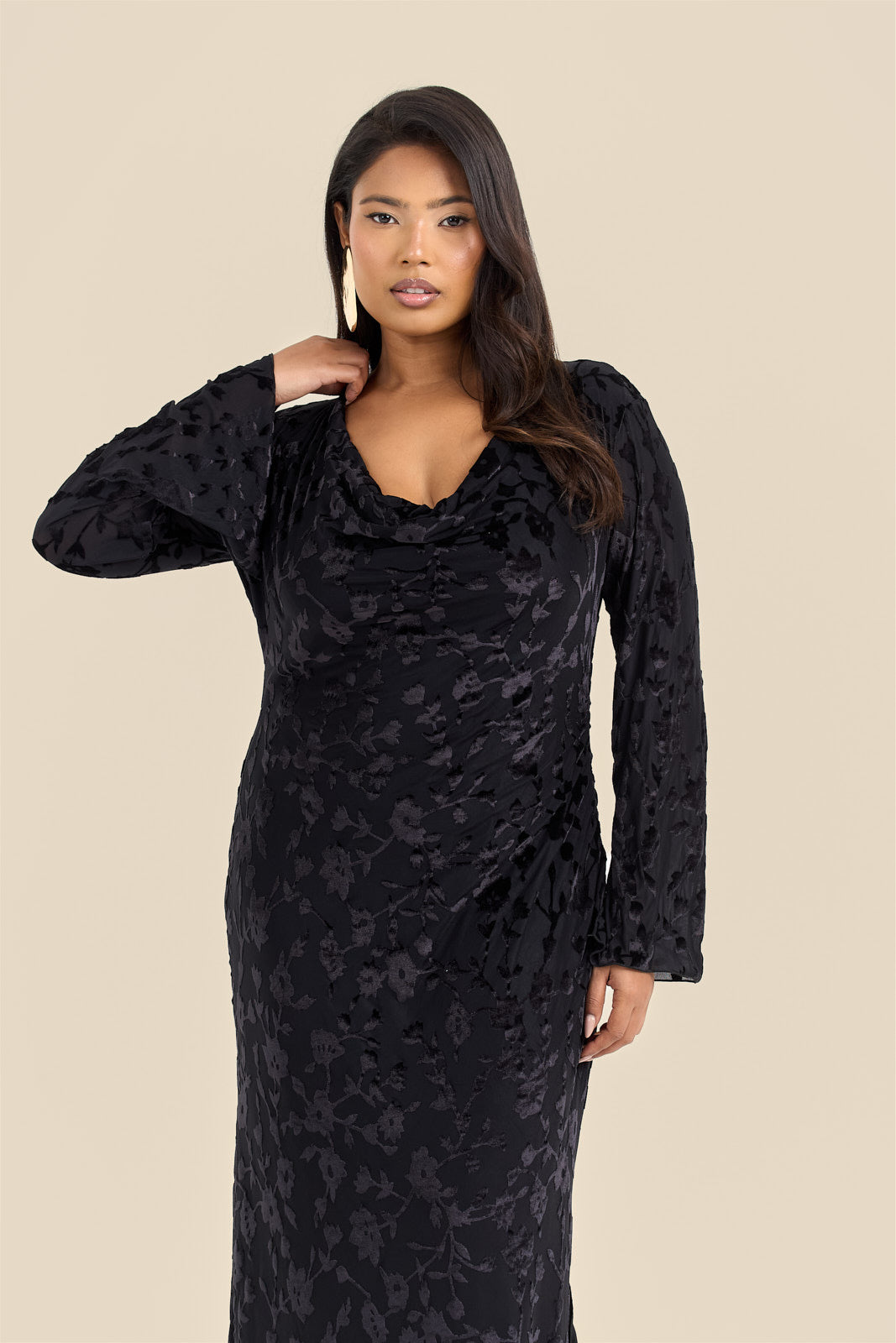 Indulge in pure elegance. This plus size black velvet devore cowl neck maxi dress is the definition of luxe dressing with its burnout floral pattern across sumptuous velvet fabric. The devore technique creates a beautiful contrast between sheer and opaque, whilst the elegant cowl neckline drapes perfectly across your shoulders. The flowing maxi length with long sleeves gives you full coverage that feels graceful and sophisticated.