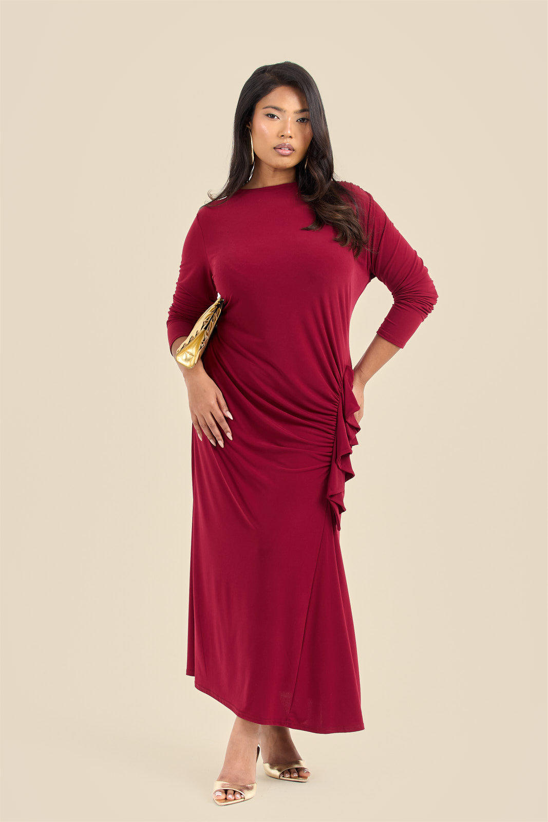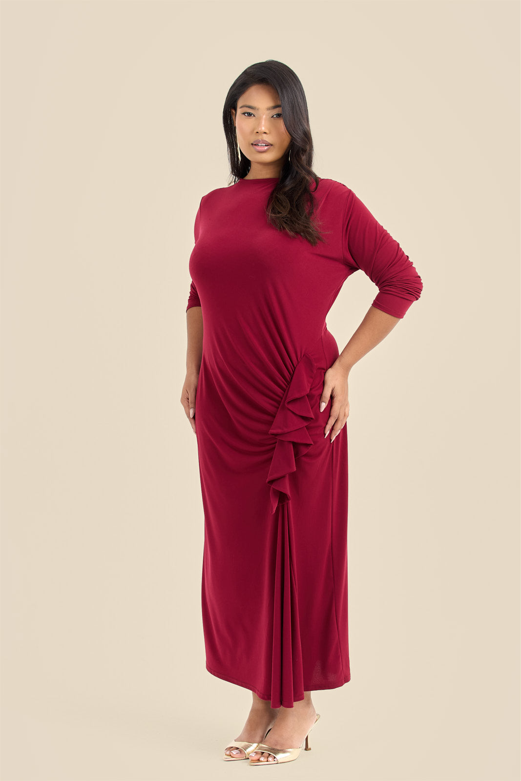 A bold burgundy midi that celebrates curves with playful ruffle detailing along the sides. This dress strikes the perfect balance between statement-making and wearable—ideal for nights out, special occasions, or whenever you want to feel effortlessly fabulous. The soft fabric drapes beautifully while the ruffles add movement and dimension. Slip it on and let the compliments flow.