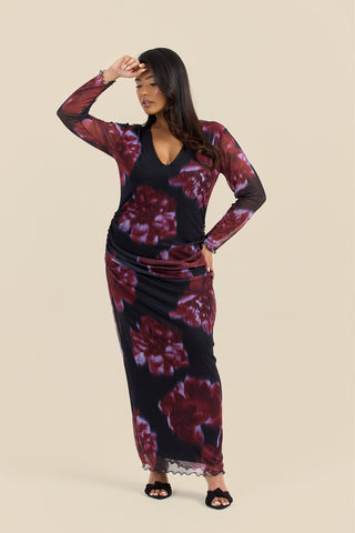 Plus Size Berry Abstract Print Angel Sleeve Maxi Dress