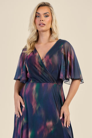 Curve Dark Water Colour Wrap Front Angel Sleeve Maxi Dress