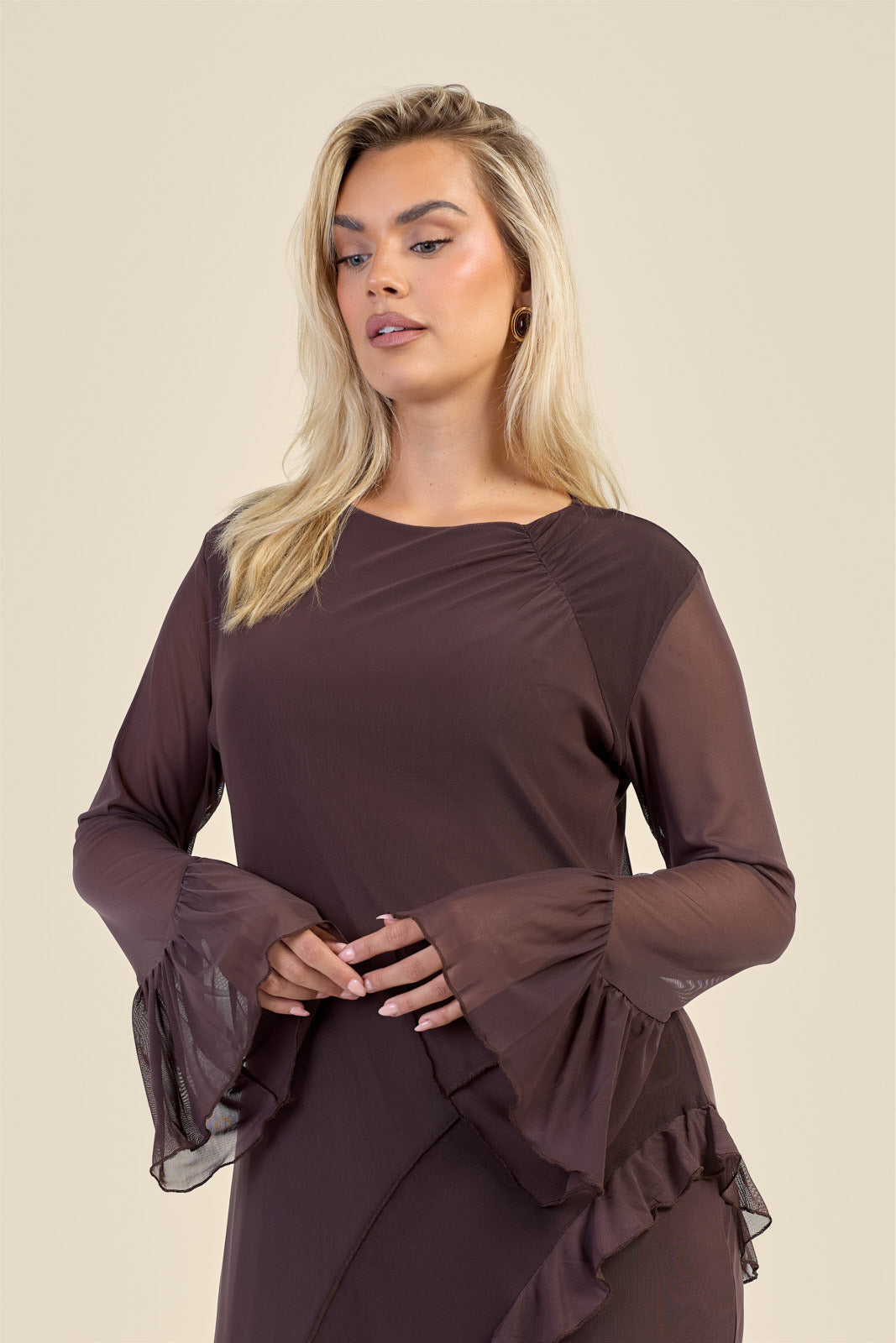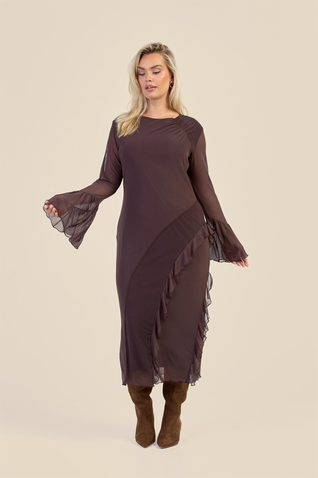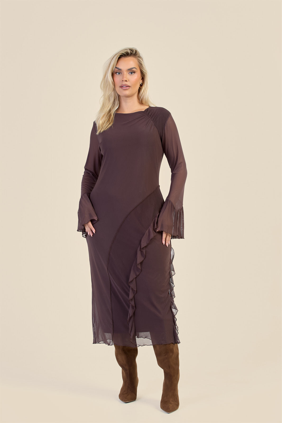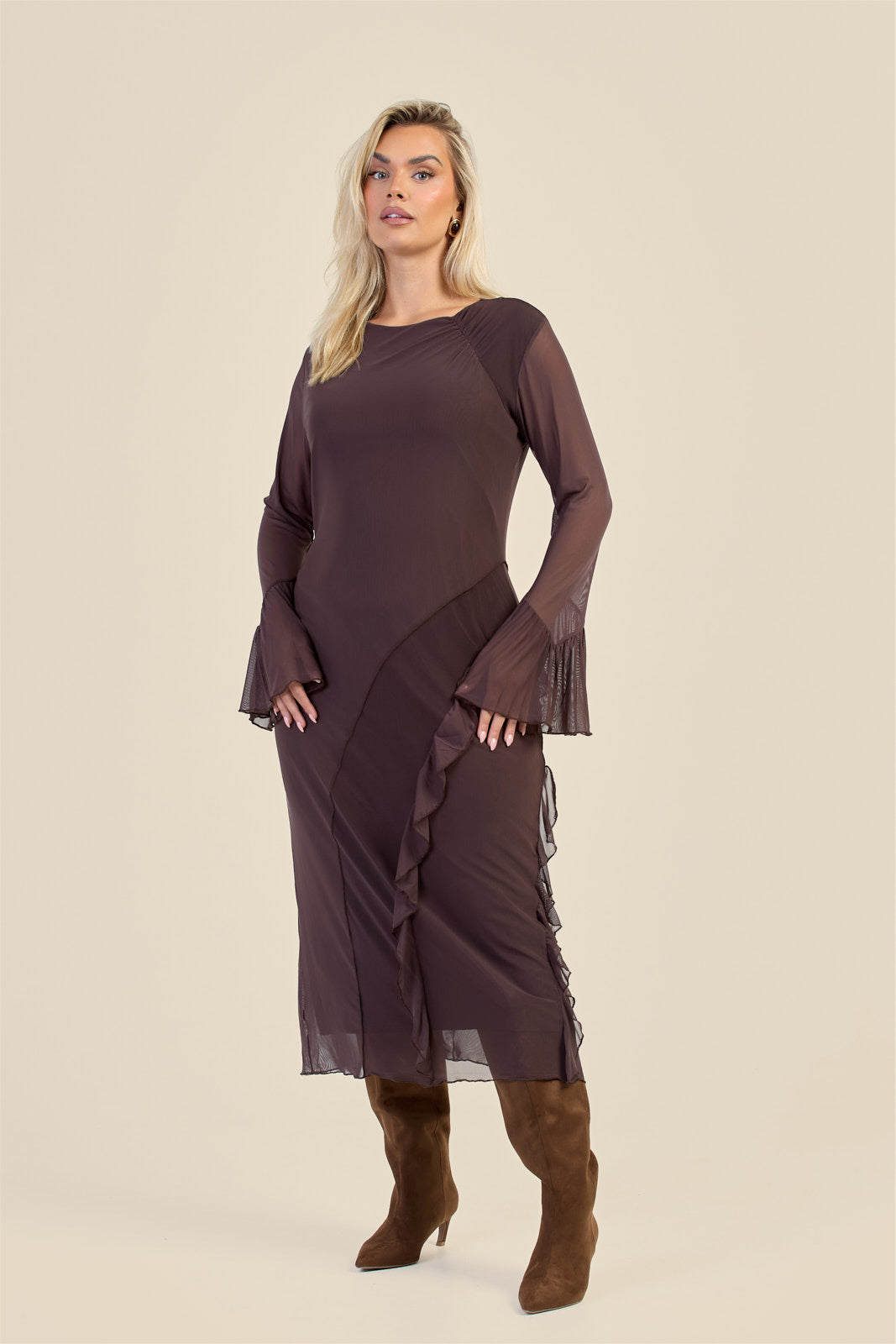 Turn heads in this Curve Mesh Ruffle Sleeve Midi Dress, where flirty ruffles meet breathable mesh for effortless style and comfort. Its midi length balances elegance with a playful edge, perfect for twirling through any occasion. Embrace your curves and let your fun side shine!