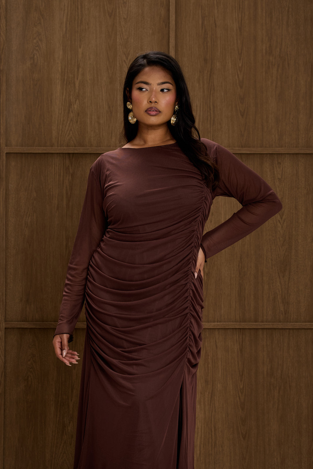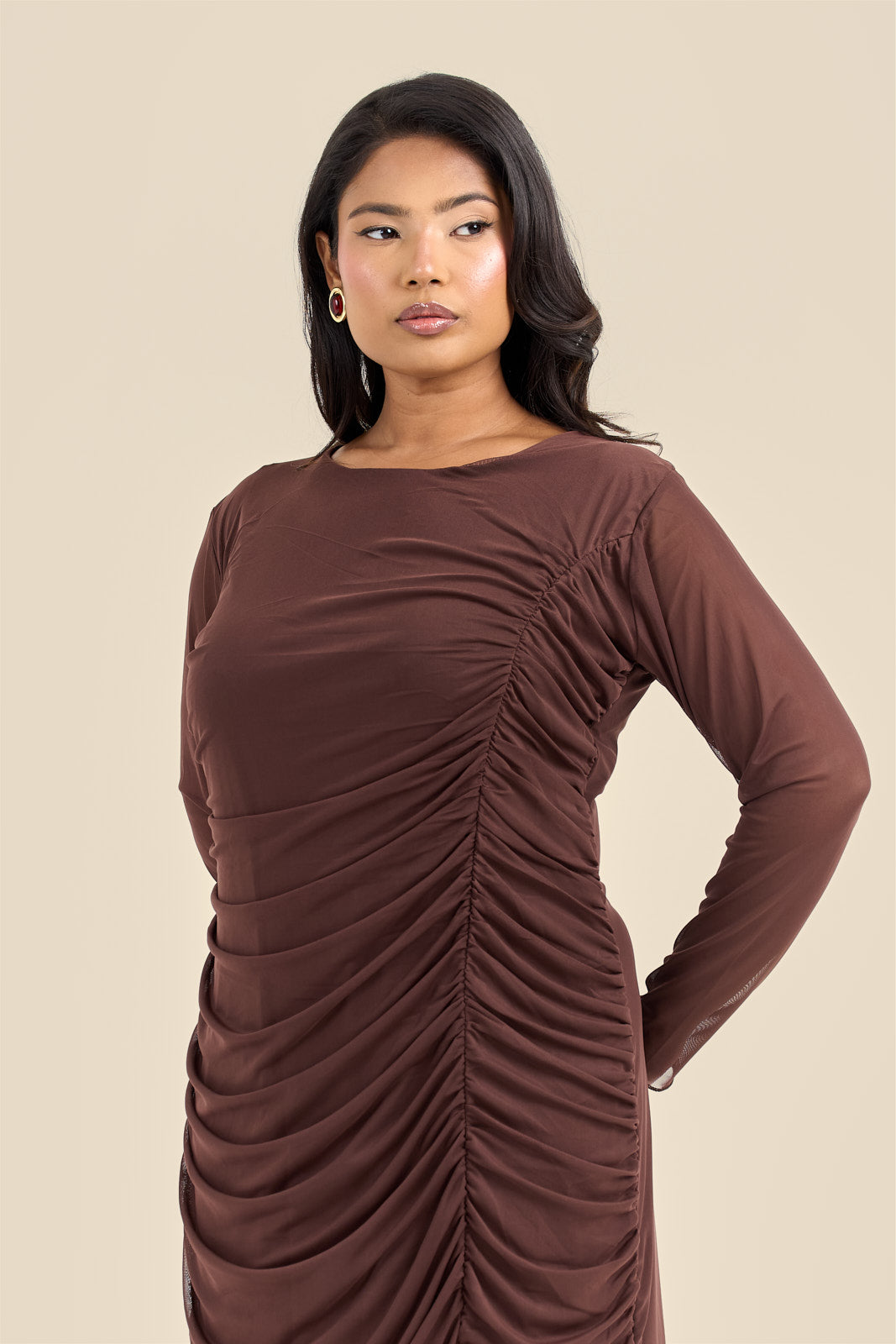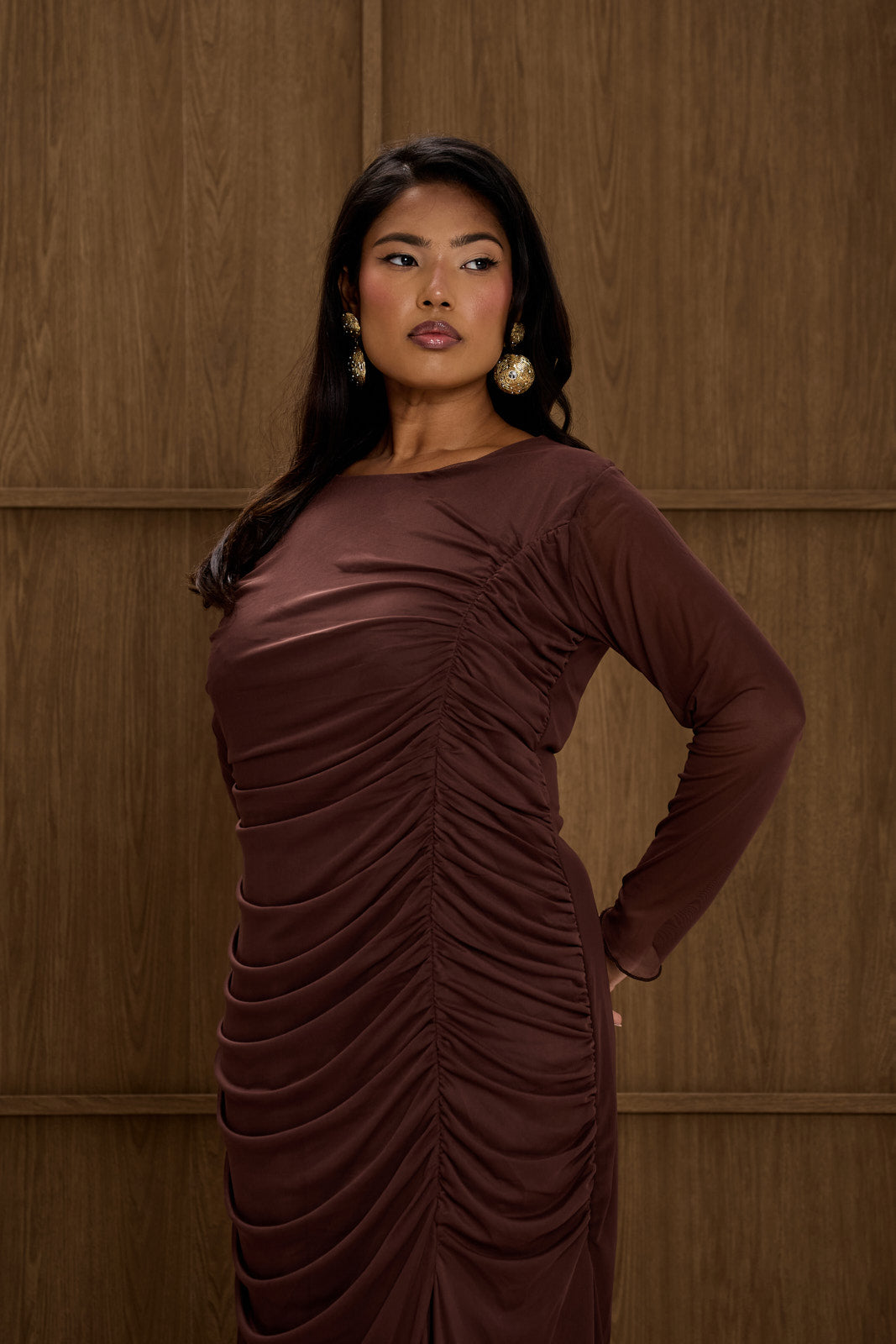 Slip into effortless elegance with this chocolate midi that hugs you in all the right places. The ruched side detailing sculpts and flatters, while luxe mesh adds a touch of flirty sophistication. Designed for curves, crafted for confidence—this is the dress that makes you feel like the best version of yourself. Perfect for nights out, special occasions, or whenever you want to turn heads.