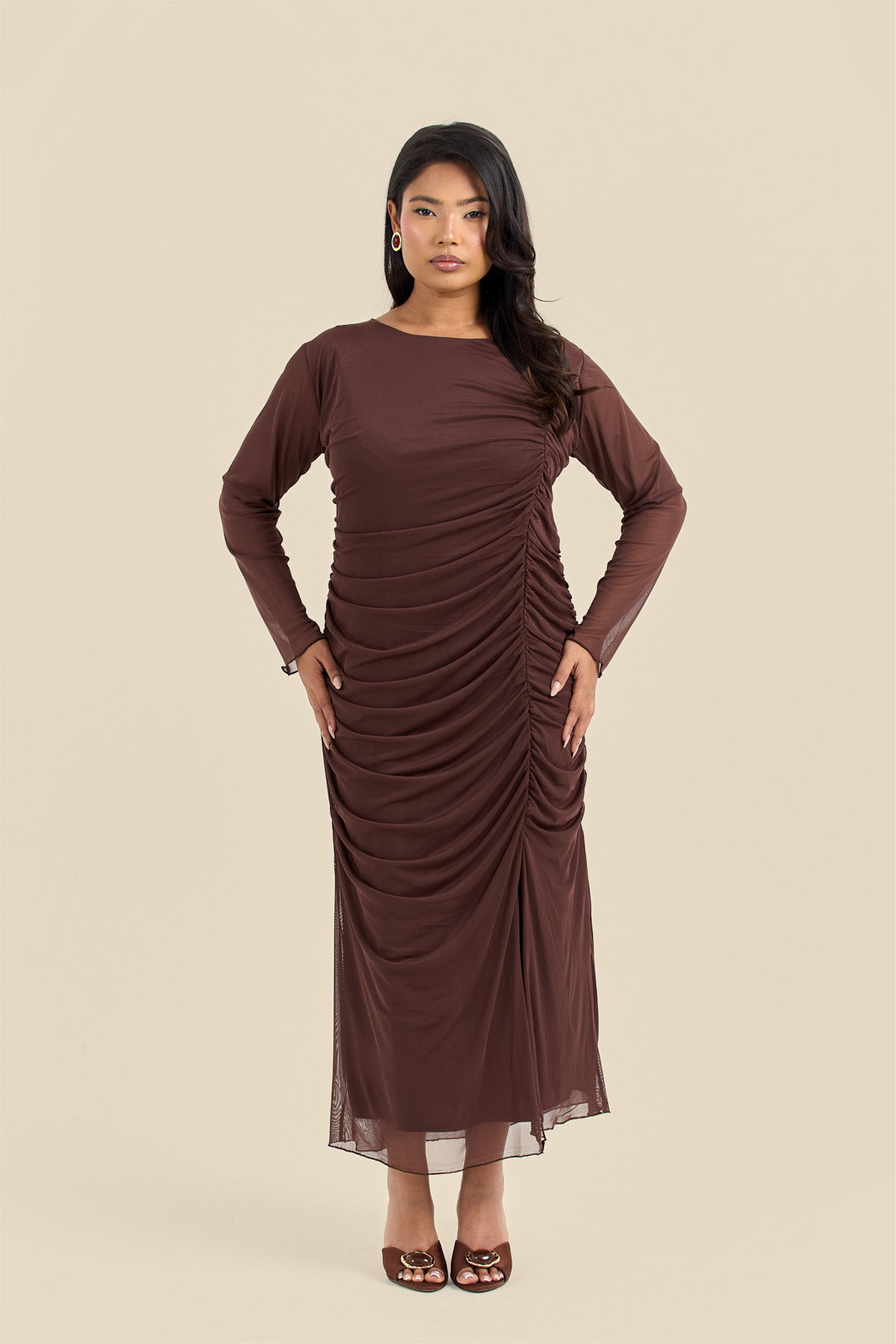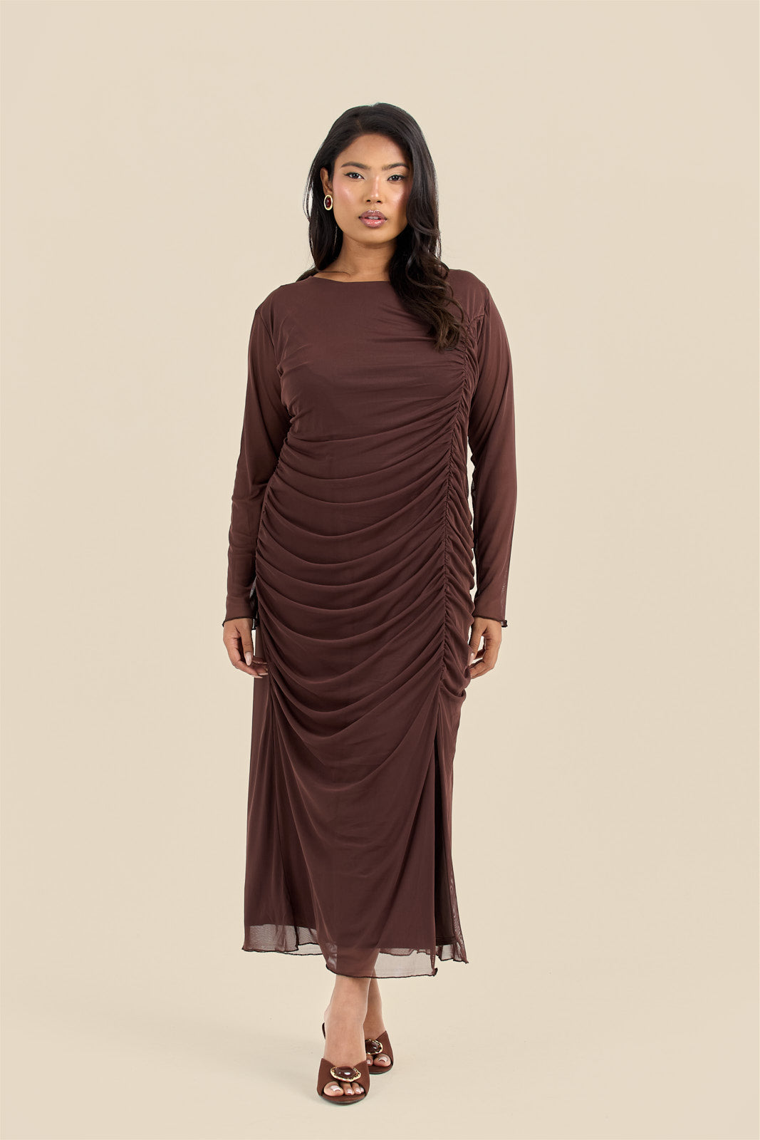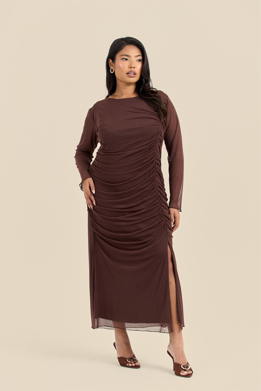 Slip into effortless elegance with this chocolate midi that hugs you in all the right places. The ruched side detailing sculpts and flatters, while luxe mesh adds a touch of flirty sophistication. Designed for curves, crafted for confidence—this is the dress that makes you feel like the best version of yourself. Perfect for nights out, special occasions, or whenever you want to turn heads.