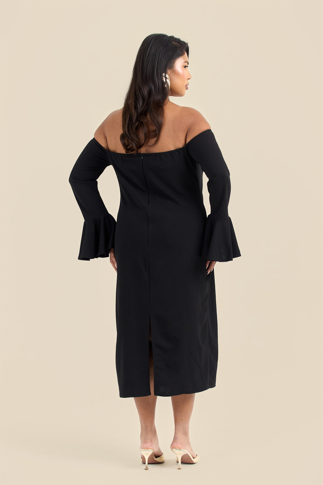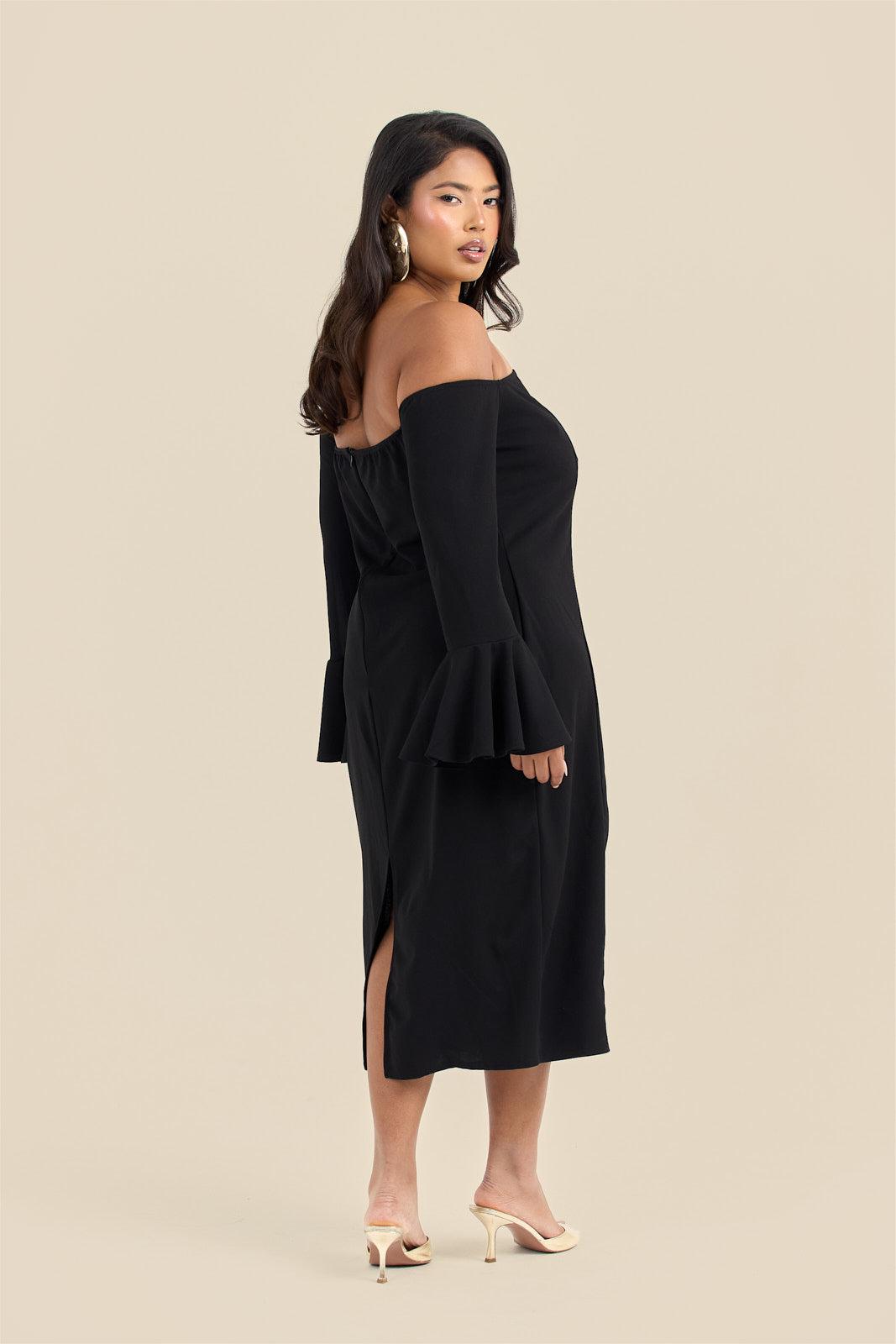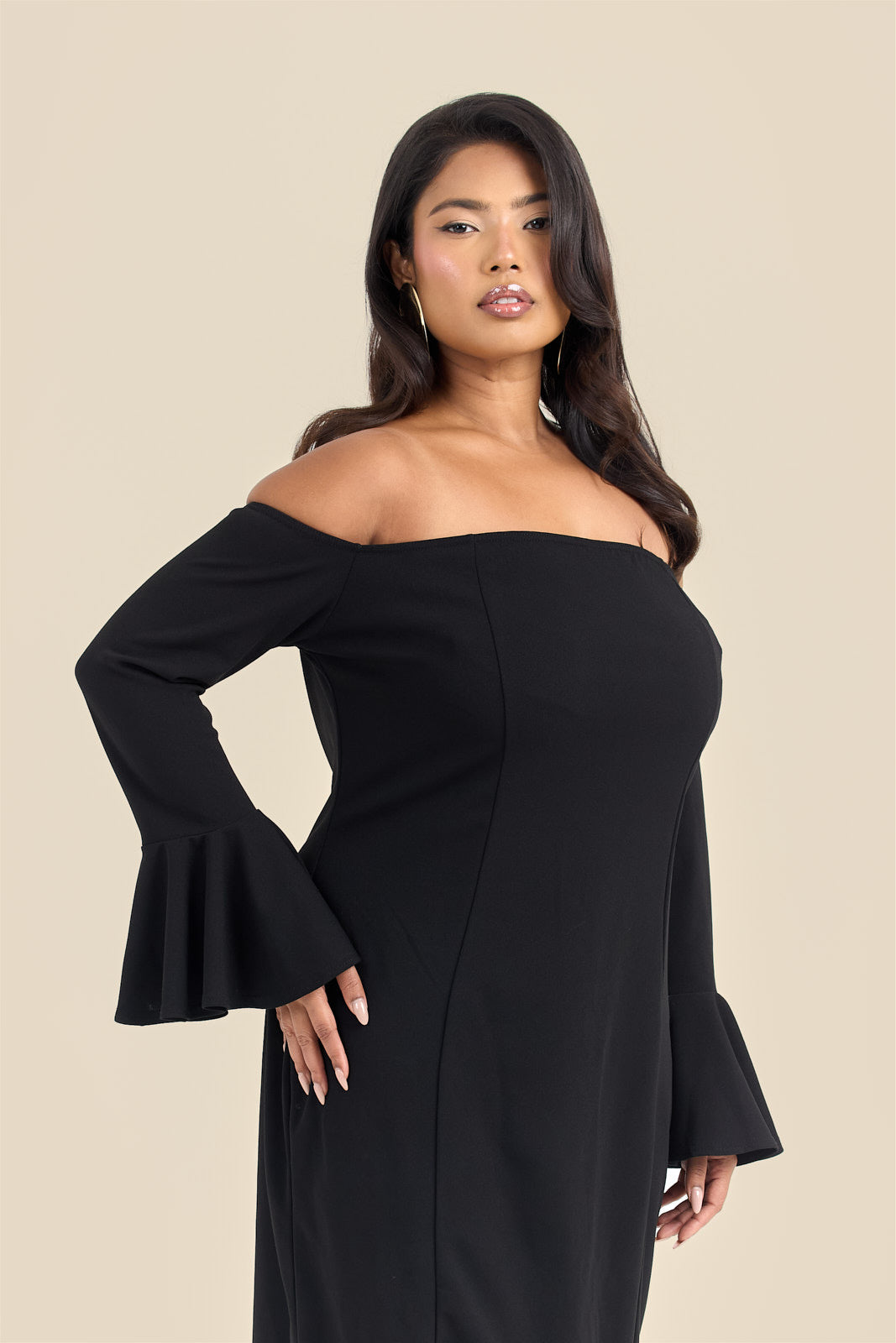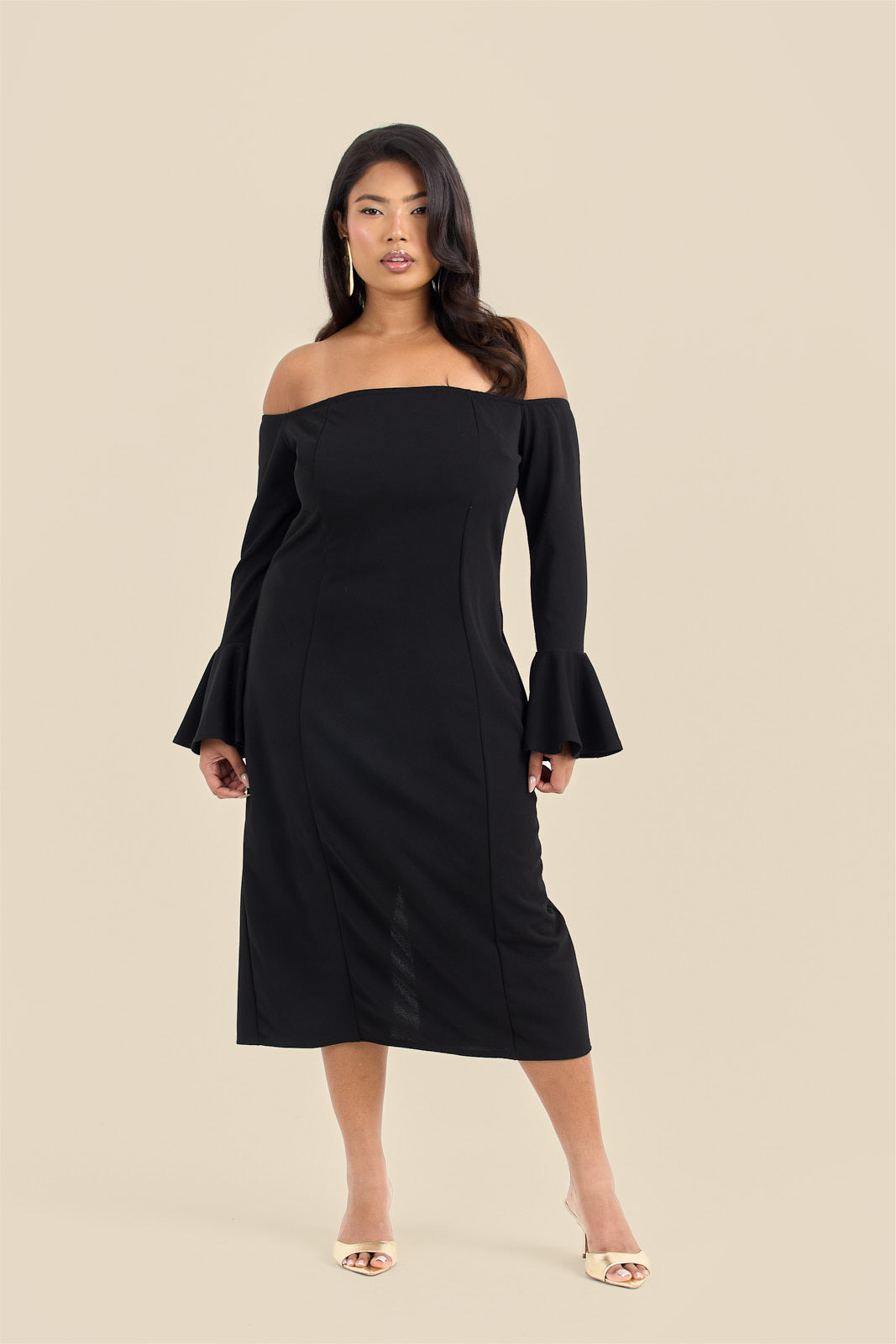 Step into the spotlight with the Curve Bardot Ruffle Sleeve Scuba Midi Dress! This flirty off-the-shoulder design highlights your curves while the playful ruffle sleeves add a fun burst of style. Crafted from smooth scuba fabric, it offers a comfortable stretch that moves with you—perfect for dancing the night away or stealing the scene on any occasion.