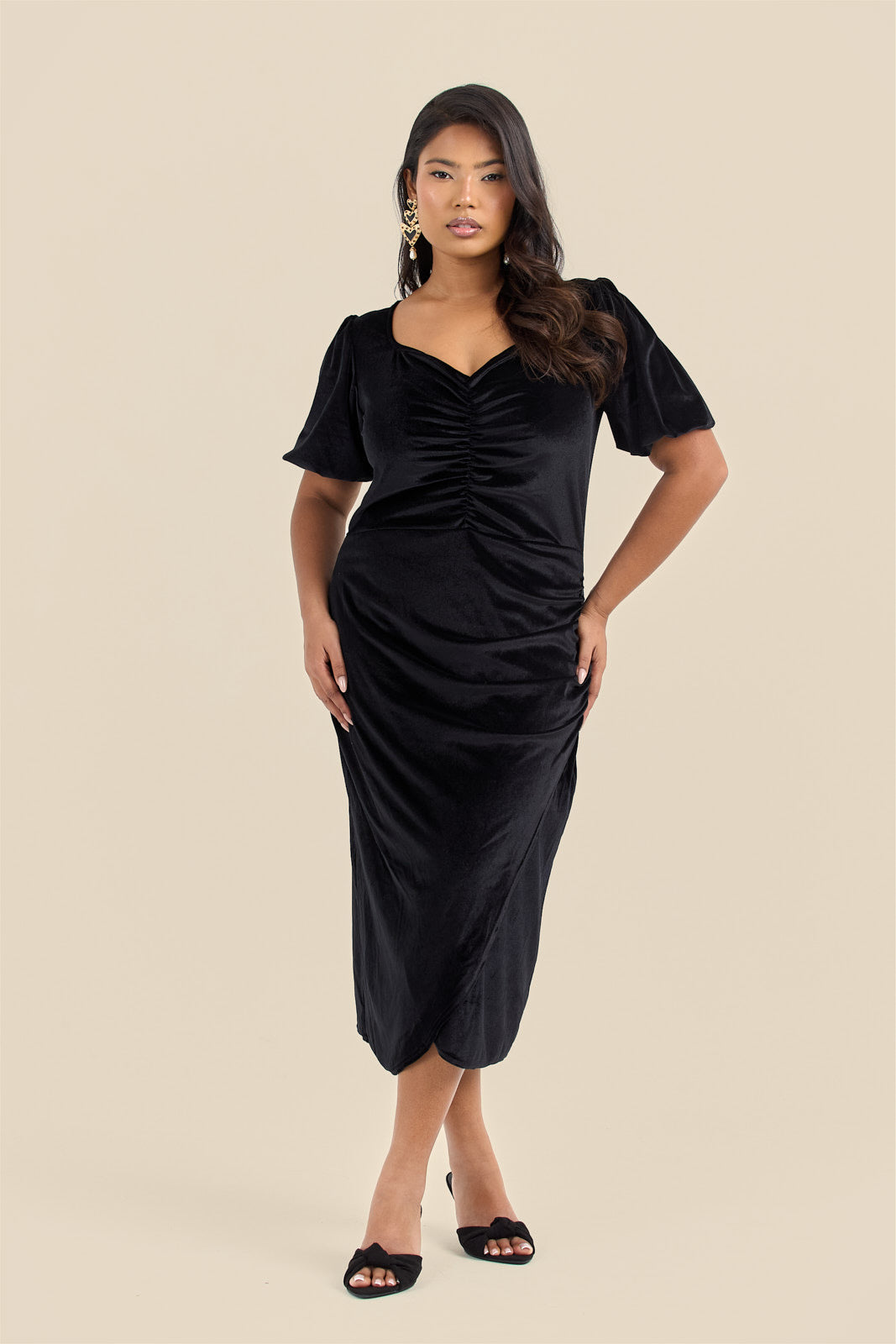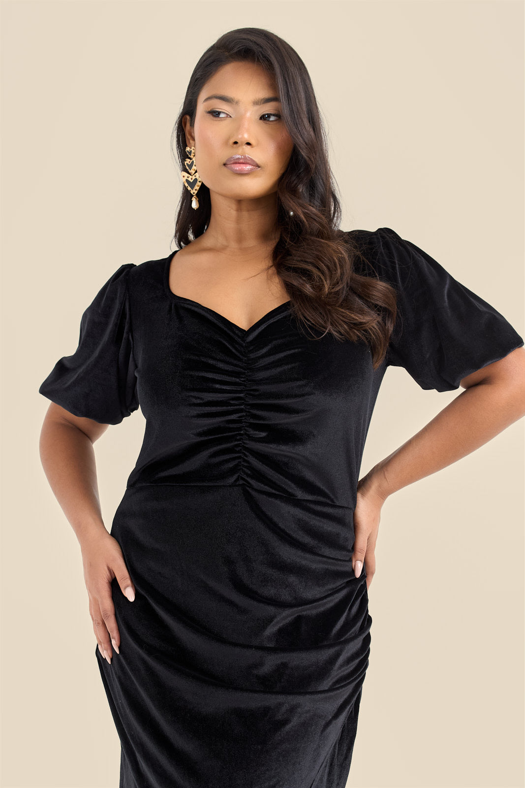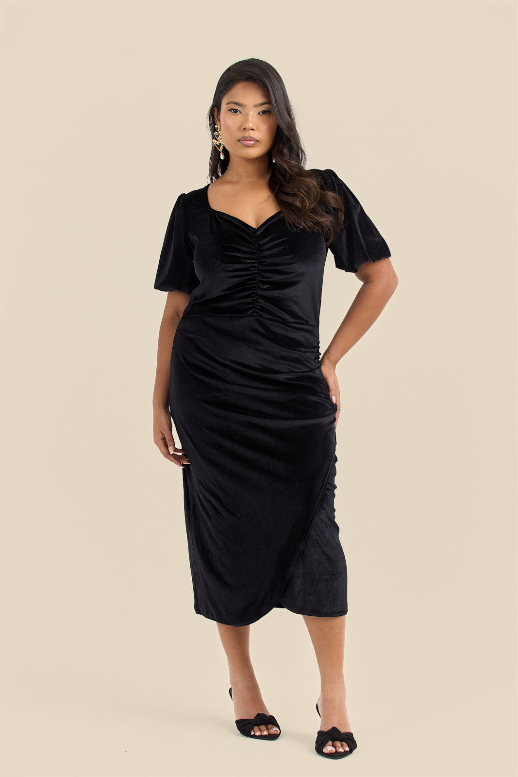 Your new favourite little black dress is here. This plus size black velvet puff sleeve ruched midi dress brings luxe elegance with soft velvet fabric that catches the light beautifully. Ruched detailing down the front and side sculpts your silhouette and creates that perfect hourglass shape, whilst dramatic puff sleeves add volume and statement. The sweetheart neckline shows off your collarbones, and the midi length hits at just the right spot.
