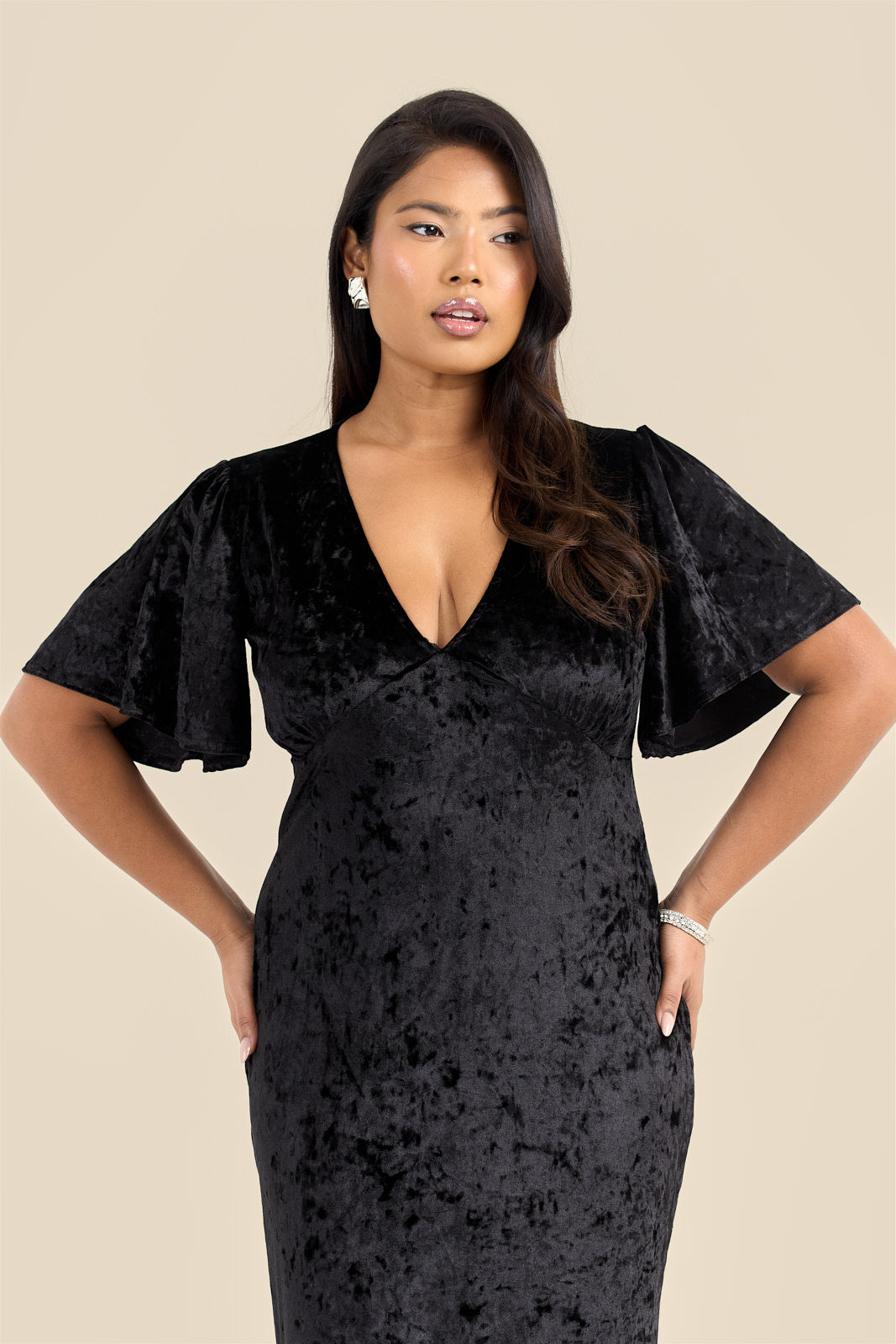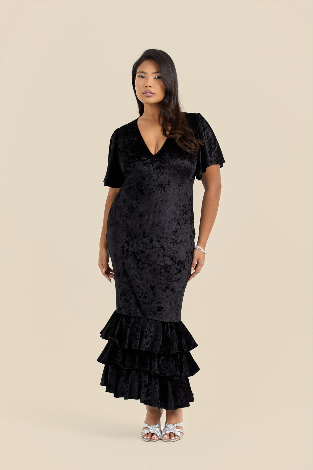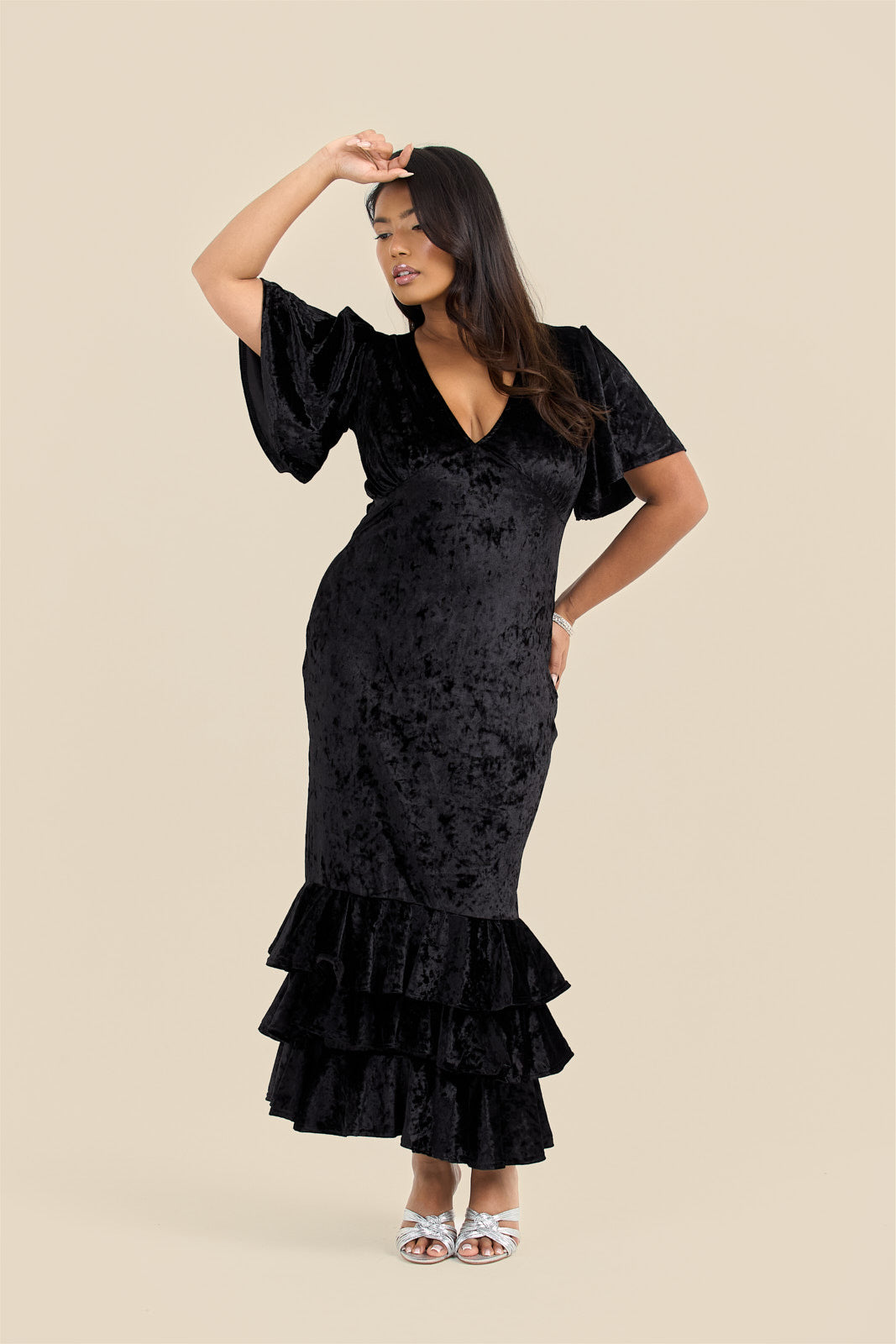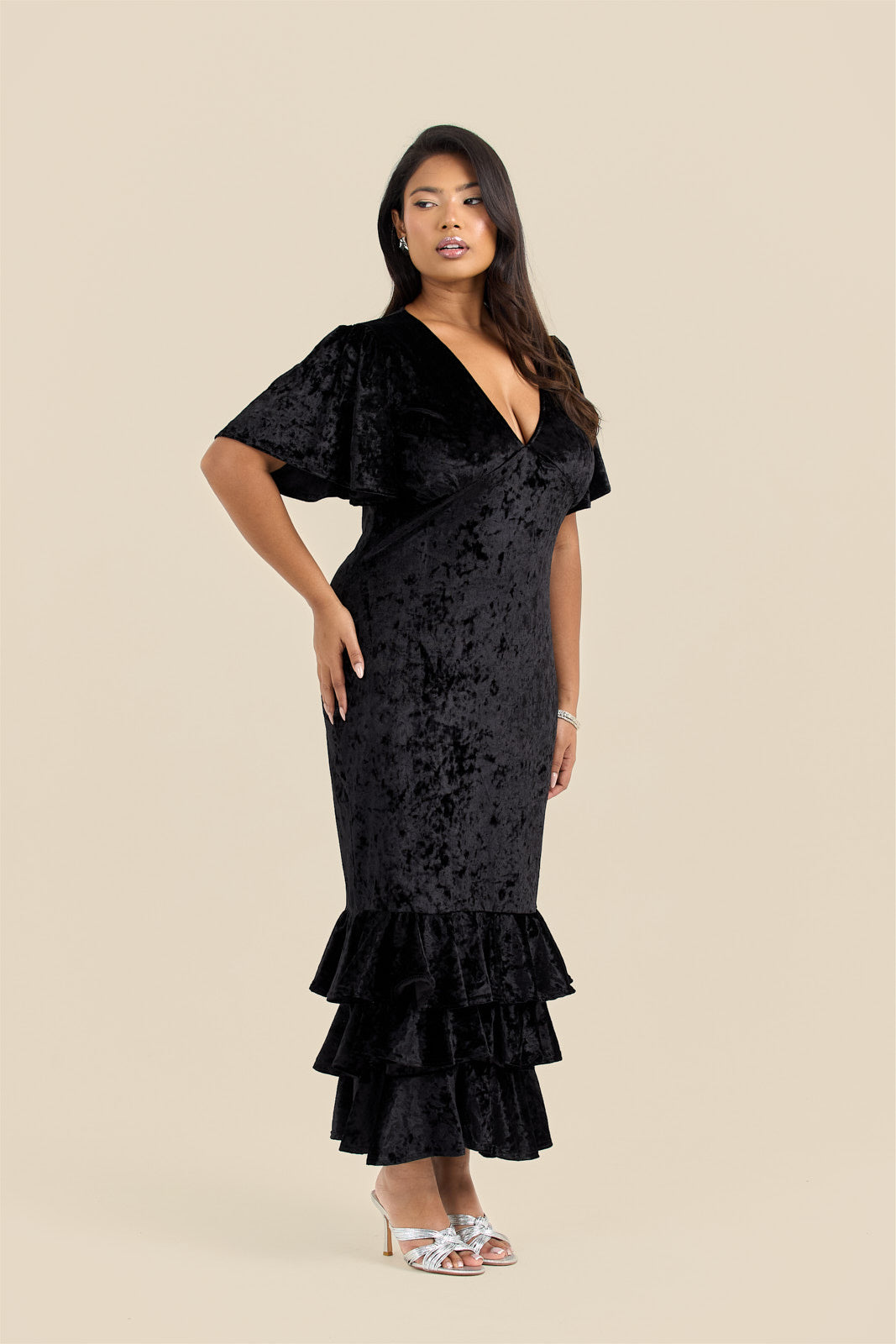 Make a statement with the Curve Statement Flutter sleeve velvet ruffle hem maxi dress. This ultimate LBD is perfect for any occasion, guaranteed to turn heads with its unique design and luxurious fabric. Say hello to your new favorite dress!