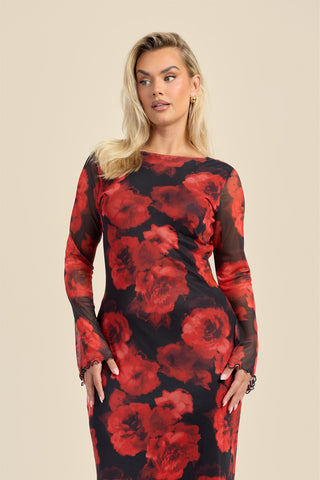 Curve ruffle detail mocha blurred floral swing style midaxi dress